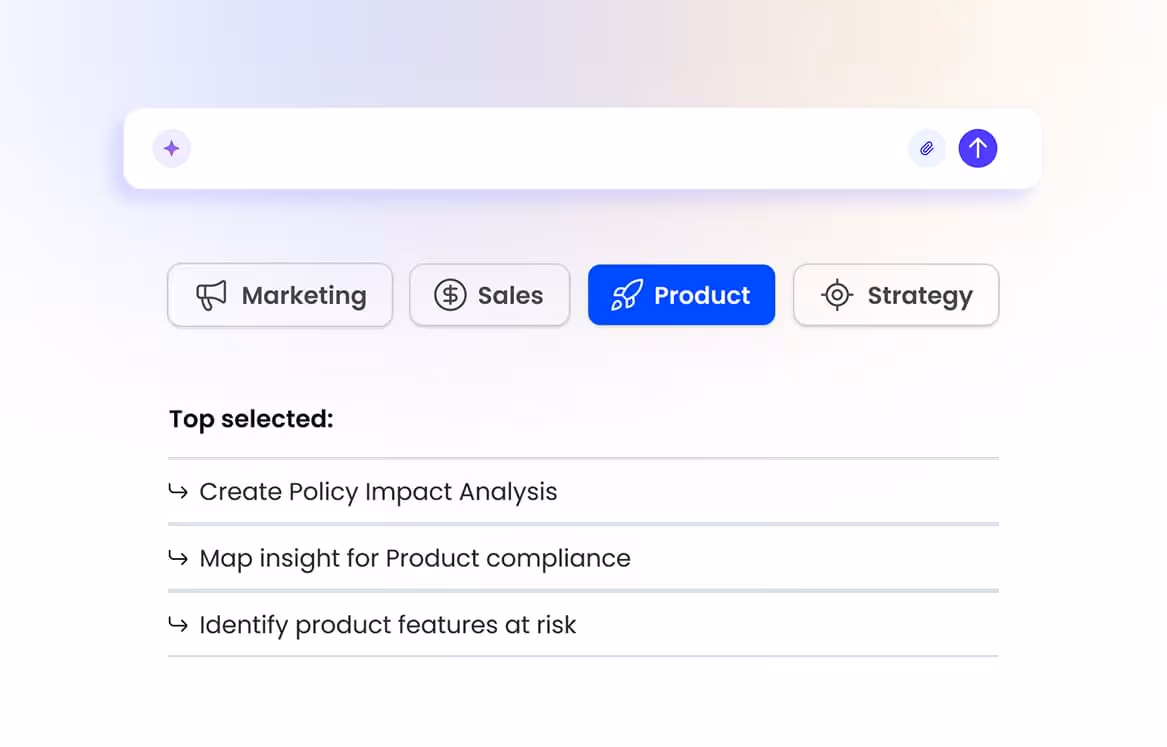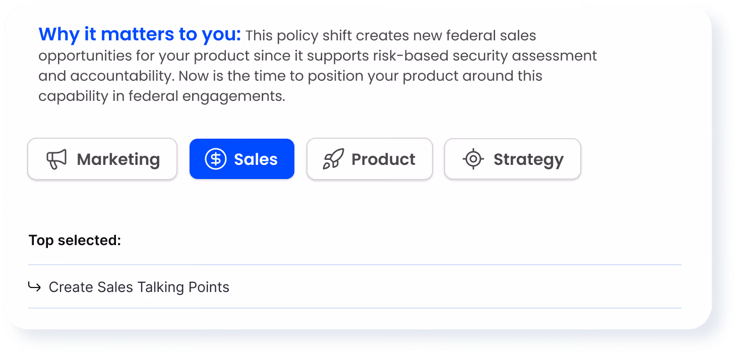Drill down into any policy insight, identify exactly what matters for each stakeholder, and share clear, actionable intelligence with sales, product, compliance, and leadership in one click.