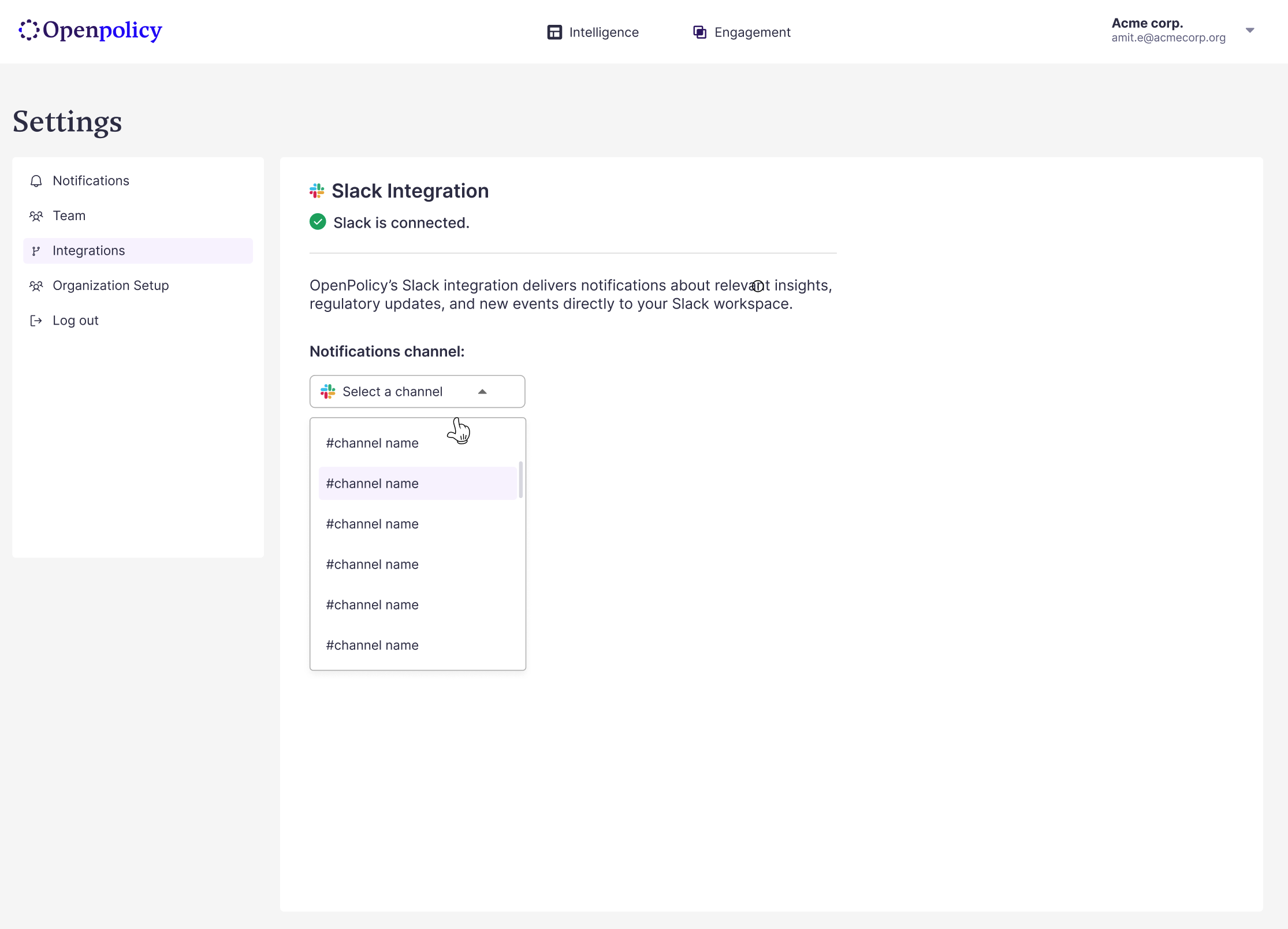 Select the channel (Notice if it's a private channel, first go to that channel and send a message tagging "@OpenPolicy" and hit "Add them to channel" to be able to see it in this list):