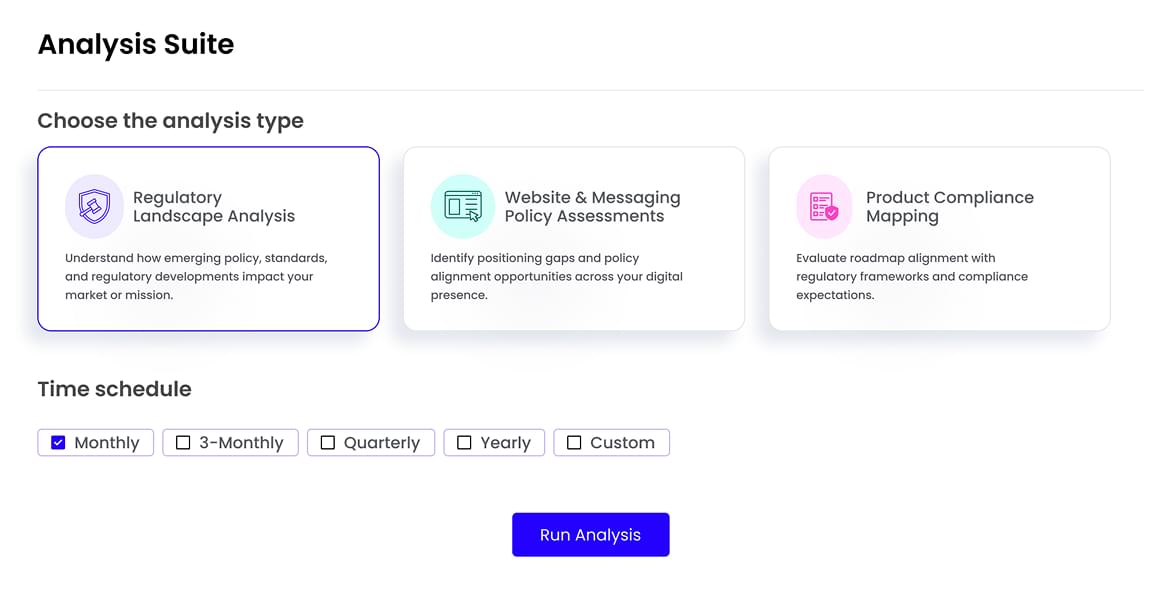 Automatically run recurring, AI-powered analysis, trained and validated by policy experts, across your digital presence, products, messaging, and compliance posture.