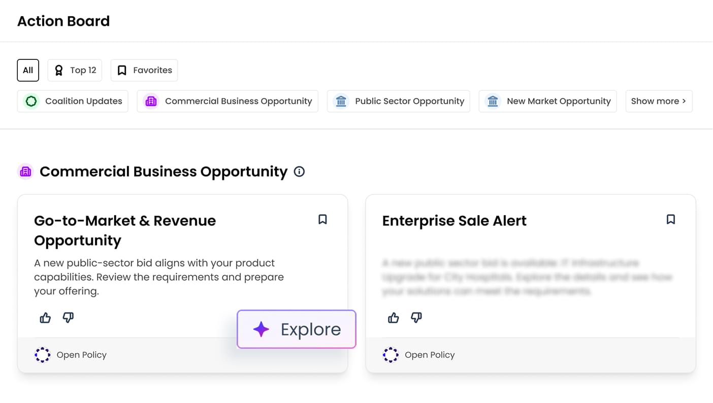 A customized and prioritized, role-based dashboard that surfaces real-time policy opportunities and risks you can activate immediately.